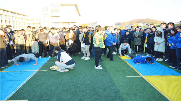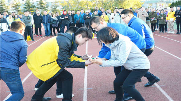 10月底的天氣雖有些寒意料峭,但比賽現(xiàn)場激情飛揚(yáng),各參賽隊(duì)之間你追我趕,競爭激烈。八個(gè)項(xiàng)目依次進(jìn)行,比賽高潮迭起,歡笑聲和加油聲交織在一起,令人歡欣鼓舞。八個(gè)項(xiàng)目中最精彩的要數(shù)運(yùn)動會壓軸戲“指壓板接力”。“網(wǎng)紅”指壓板可謂大名鼎鼎,但許多參賽隊(duì)員只在各種綜藝節(jié)目中見過,賽前有人對它不屑一顧,但當(dāng)真正脫下鞋子與它親密接觸后,才感受到它的“威力”。比賽每隊(duì)四人一組,第一名運(yùn)動員在指壓板上跳繩,跳滿20個(gè)接力給第二個(gè)運(yùn)動員,第二名運(yùn)動員在指壓板上作俯臥撐,做滿20個(gè)接力給第三人,第三名運(yùn)動員在指壓板上手腳并用爬行10米,傳遞給最后一名運(yùn)動員,最后一個(gè)人額頭上放一枚餅干,在指壓板上沖刺同時(shí)保證餅干不掉,第一個(gè)沖過終點(diǎn)的隊(duì)伍獲勝。伴隨著腳下的一陣陣“電流”,參賽運(yùn)動員們爭先恐后“痛并努力著”,拉拉隊(duì)的歡呼吶喊聲也將本次趣味運(yùn)動會推向一個(gè)小高潮。